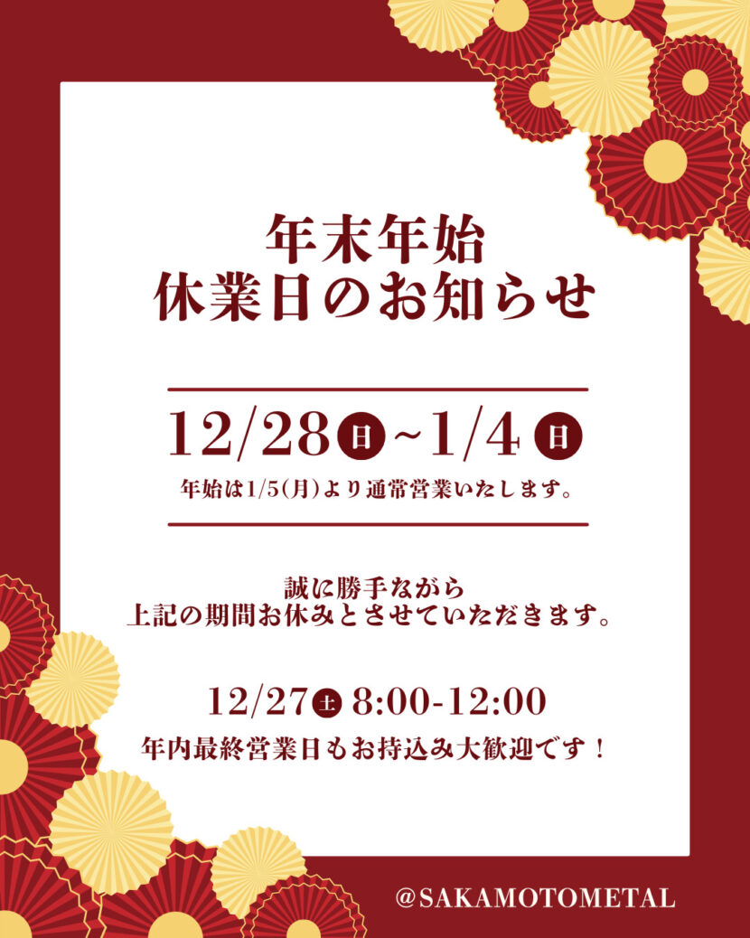 12月の営業日についてお知らせいたします。 営業時間 8:00~17:00 ※17:00以降や土曜日の持込み […]
